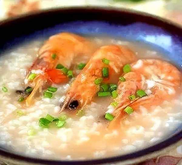 8.粥开始变稠时,将蟹油、姜末和虾仁放入锅中,