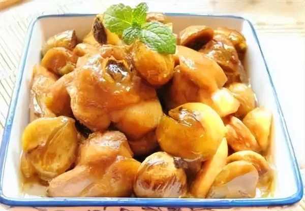 6、将鸡块和栗子放入盘中,锅内用水淀粉勾芡,加入鸡精调味,淋上少许开油浇在鸡粒上。
