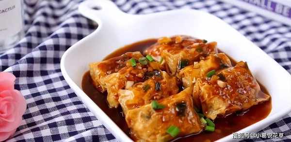 5、锅中放少许油,放入豆腐皮肉卷小火煎至两面金黄。倒入准备好的酱汁,关上锅盖煮2-3分钟左右,加点汤更入味。将做好的豆腐皮肉卷装盘,淋上汤汁,撒上葱花。