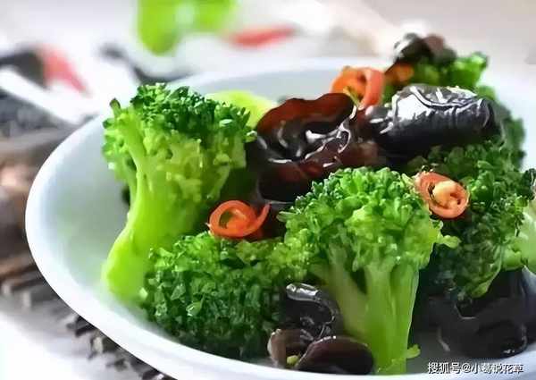 材料:西兰花1个,干黑蘑菇5克,盐2克,鲜酱油5克,小红辣椒1个,玉米油适量,花椒油少许。