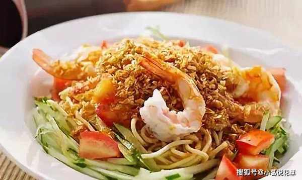 6.将面条放入碗中,淋上煮熟的虾仁、黄瓜碎等,淋上凉面酱即可食用。