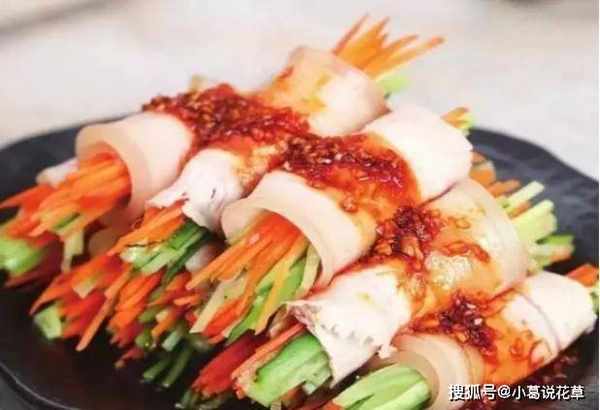 4.猪肉切片,加入黄瓜丝和红萝卜丝卷成白肉卷,备用。