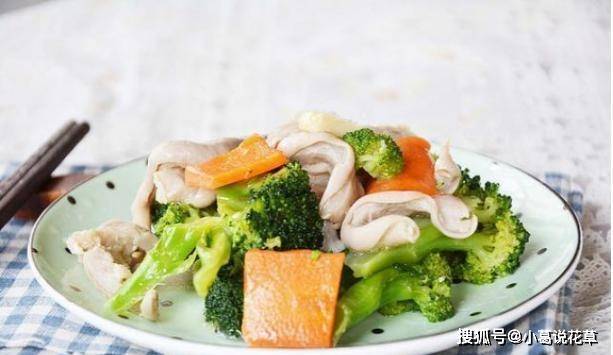 材料:西兰花、胡萝卜、熟猪肉、盐、料酒、蒜、姜