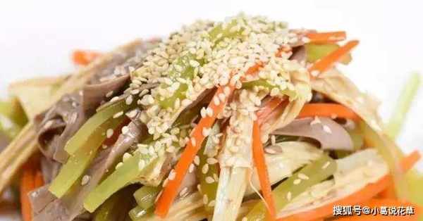 生菜丝加少许盐,拌匀,腌好水,沥干,倒入碗中,加入黑腐竹、腐竹、胡萝卜,加入上述香料,拌匀,装盘,撒上白芝麻种子。
