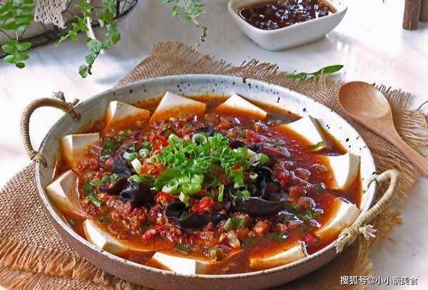 材料:豆腐1块、猪肉100克、豆瓣酱1勺、葱2根、生抽2勺、淀粉少许、盐少许、黑菇20克