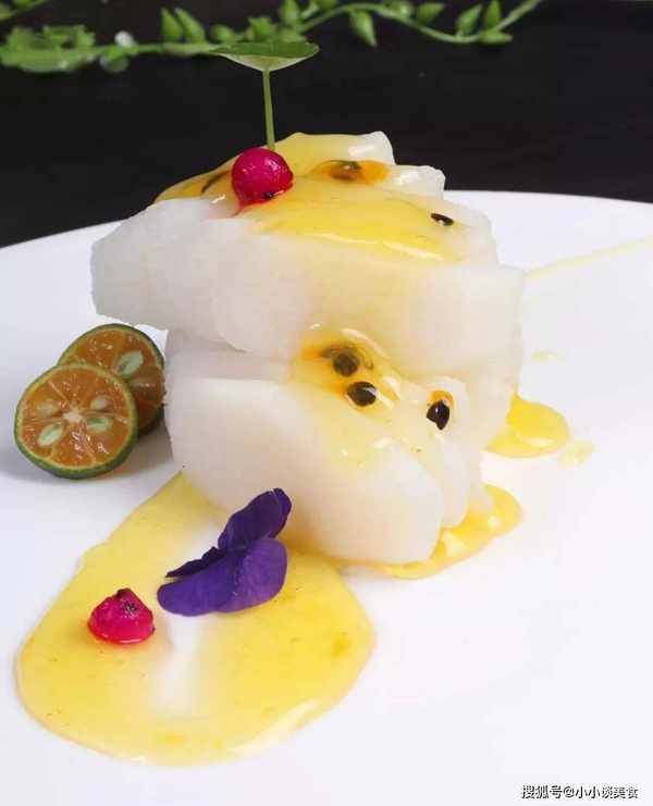 4、将泡下味的山药切成片,取200克叠放在盘子里,50克做好的百香果酱,装盘装饰,即可食用。