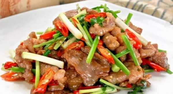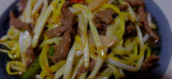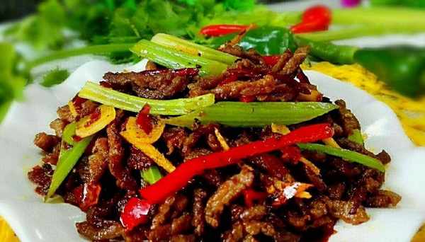 ②锅置火上,油烧热,放入腌好的牛肉丝,翻炒至牛肉呈深红色,加入豆沙继续翻炒。如果香气扑鼻,加入芹菜、糖、盐用味精翻炒,关火,装盘,撒上花椒粉。