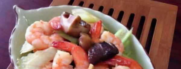 材料:香菇、虾、油、盐、酱油、料酒、姜、小葱。
