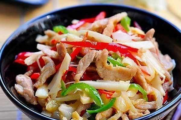 材料:酸笋150克,猪肉120克,灯笼椒1个,红辣椒1个,色拉油1汤匙,鸡汤1/8茶匙,生姜1/4茶匙,大蒜10克,大蒜10克料酒1汤匙、生抽1汤匙、生粉1茶匙、水2汤匙