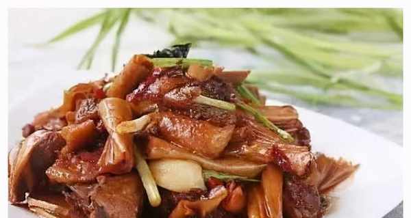 锅内倒入油,爆香蒜头,放入肉片炒至生,捞出放入蒜头。加入料酒翻炒至菜叶变软,加入肉片前翻炒一下,最后撒胡椒粉、盐和胡椒粉调味。