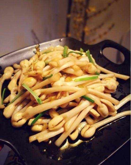 3.热锅放2汤匙肥油,倒入花生芽翻炒片刻,加入蚝油、生抽炒匀,改中火再炒2-3分钟,让花生芽吸干水分调味,出锅前加葱。