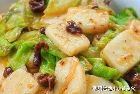 步骤:1、白菜洗净后,用手切成小块,年糕切成薄片。为减少煎炸时间,可以先焯一下水再煎。