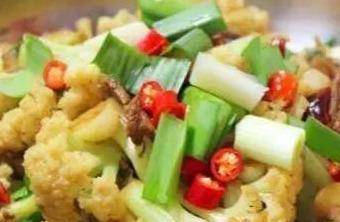 材料:菜花、五花肉、洋葱、红辣椒、干辣椒、蒜苗、葱蒜、盐、酱油、鸡粉