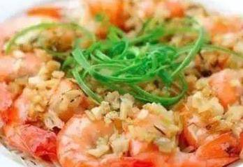 3、龙口粉丝泡好,装盘,把大虾放在粉丝上面,再在虾肉上均匀撒上一层蒜。加入腌虾的料酒和酱油,蒸8分钟。4.在锅底撒上切碎的葱,然后从锅中倒一些热油。