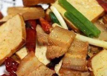 2.锅中油烧热,下五花肉翻炒,油温上升后,将肥肉尽量炸至金黄色,加入干辣椒和胡椒粉