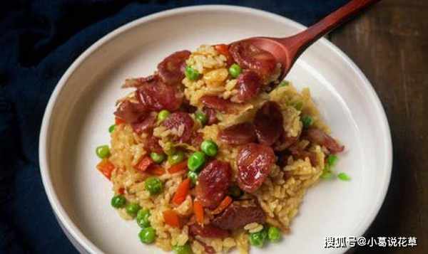 材料:米饭、香肠、三粒(豌豆、胡萝卜丁、玉米粒)、葱姜末、盐、生抽