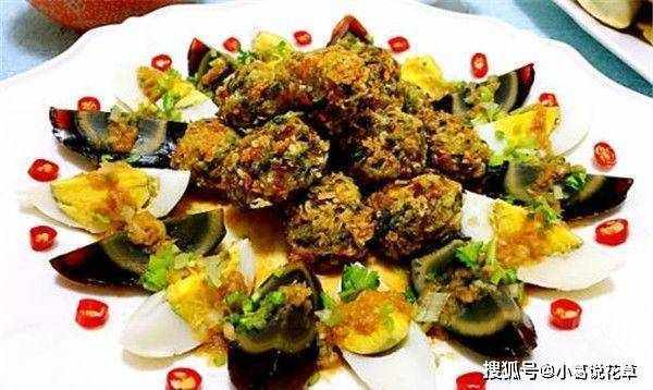 2、取一个大平盘,中间放一朵番茄花,四周交替铺上一圈松花瓣和一圈咸鸭蛋瓣,然后在番茄花上放入泡好的芹菜;