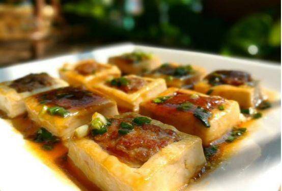 步骤1.豆腐切成大方块,用勺子挖出石头。