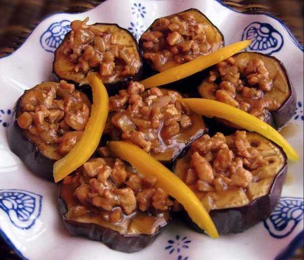 8.将蒸好的茄子放到另外一个盘中里,把肉馅撒到每个茄子上面。