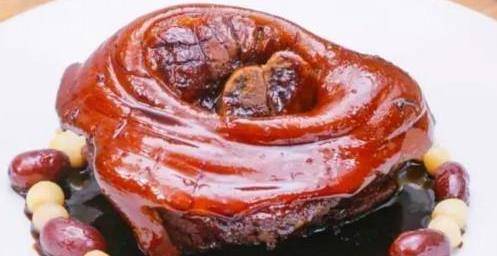 6、炖至筷子可以轻插即可;把蹄子放在盘子里,把炖蹄子的水放入水淀粉和鸡精中,拌匀浇在上面。