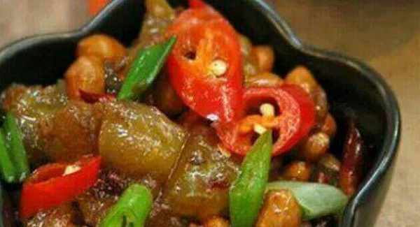 8.将调好的汁倒入锅中炒匀,放入花生米、青红椒圈翻炒片刻即可