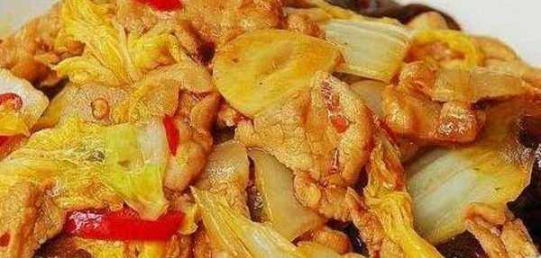 8、炒至白菜叶变软,加入炸好的肉片和油。