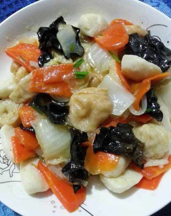 2.锅里放油,把红萝卜和黄芽炒软,加入香菇鱼丸等,加生抽、盐、鸡粉和少许水煮至入味,勾芡,淋上香油上面撒上胡椒粉,葱花就可以上桌啦!