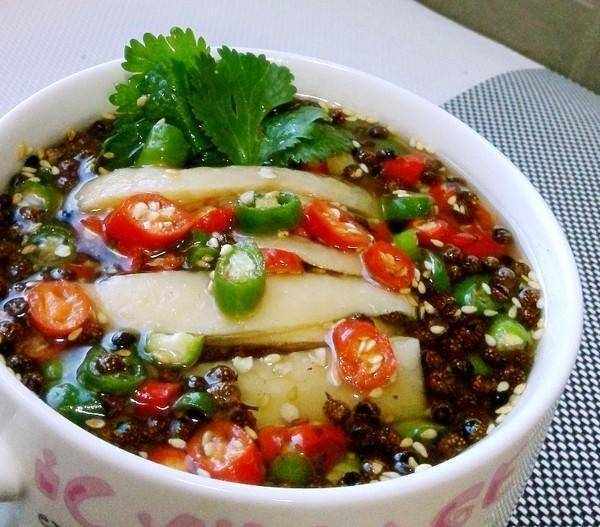 材料:朝天椒适量,姜2片,蚝油1茶匙,醋2茶匙,酱油1/2茶匙,辣椒油2茶匙,香油1茶匙,香油1/2茶匙盐、蒜3瓣、葱1条、鸡粉少许
