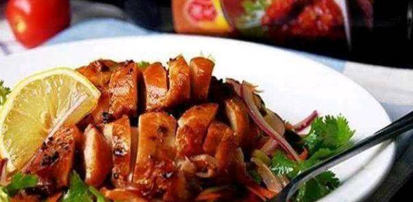 4.将烤鸡切好放在沙拉上,挤上柠檬汁。