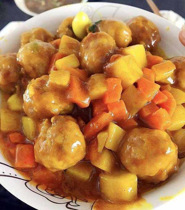 5.将水和咖喱块放入热锅中,小火煮咖喱至咖喱融化,然后倒入丸子、土豆和胡萝卜,小火煮至土豆变软变粘。