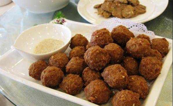 4、藕用工具磨成藕片,加入准备好的肉馅中拌匀;5.将肉馅揉成球状,在糯米上面擀一层米;