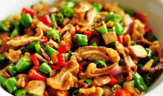 1.猪骨切成薄片,辣椒切小段(小贴士:怕辣的可以换成不辣的青椒),姜切末,蒜切片待用;