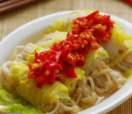 2、油锅放入葱、姜、蒜、辣椒炒香,加盐、鸡精拌匀,淋在金针菇上。3.将酱汁与蚝油、酱油、醋、辣椒油和香油混合,均匀淋在金针菇上即可,最后撒上葱花点缀