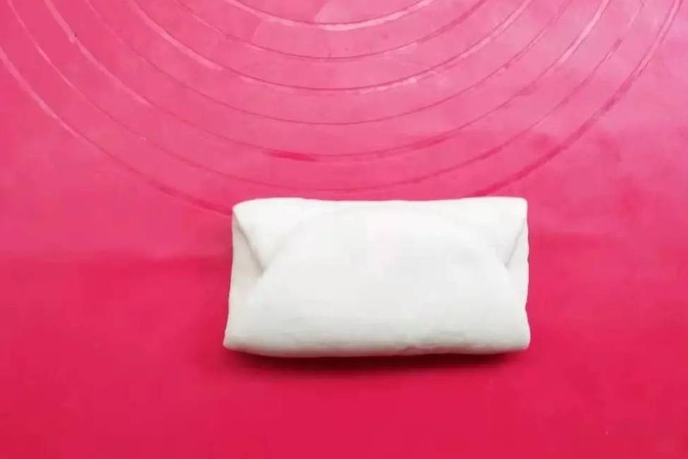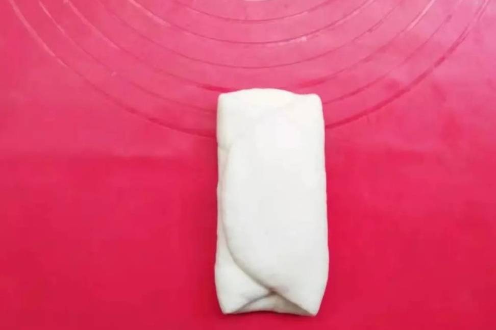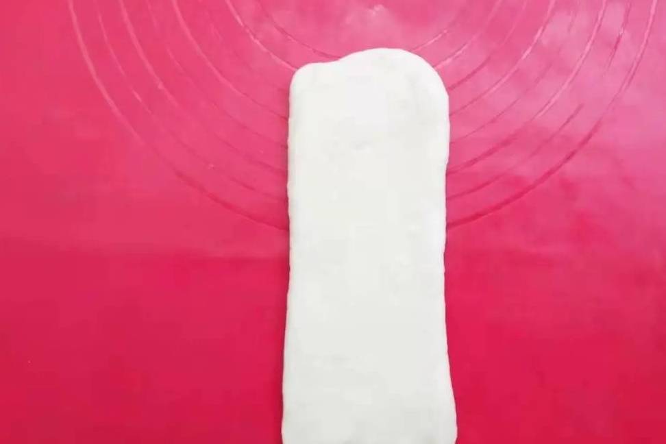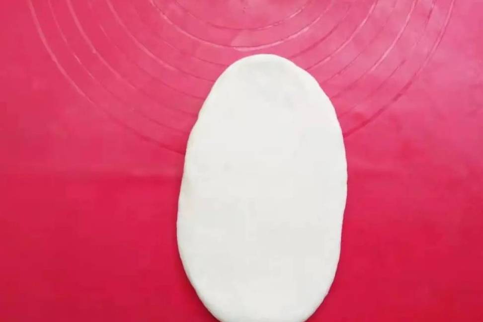 步骤6取出一个松弛的面团,拍扁,擀开成椭圆形,翻面