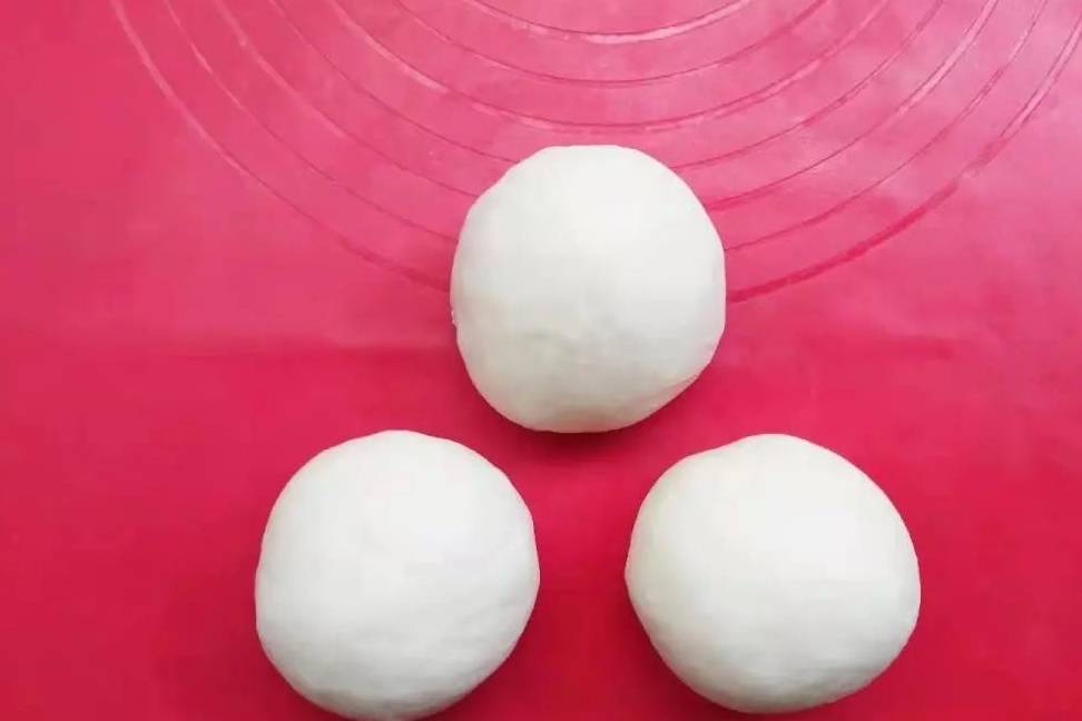 步骤5取出发酵好的面团,按压排气,均分成3份,全部滚圆,盖保鲜膜松弛15分钟
