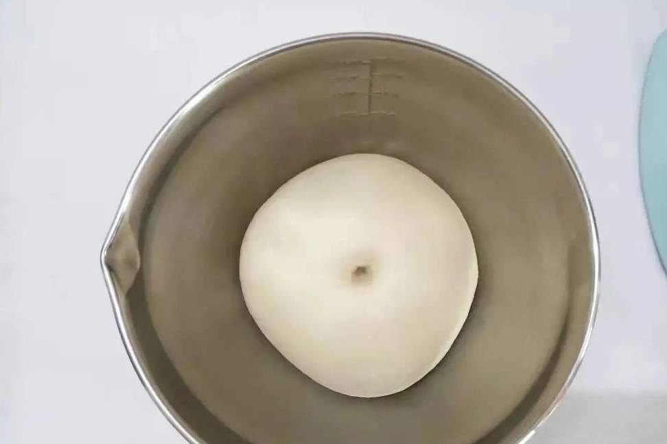 步骤4将面团收圆,放在容器里,盖保鲜膜发酵至两倍大,用手指粘粉戳洞不回缩不塌陷即可