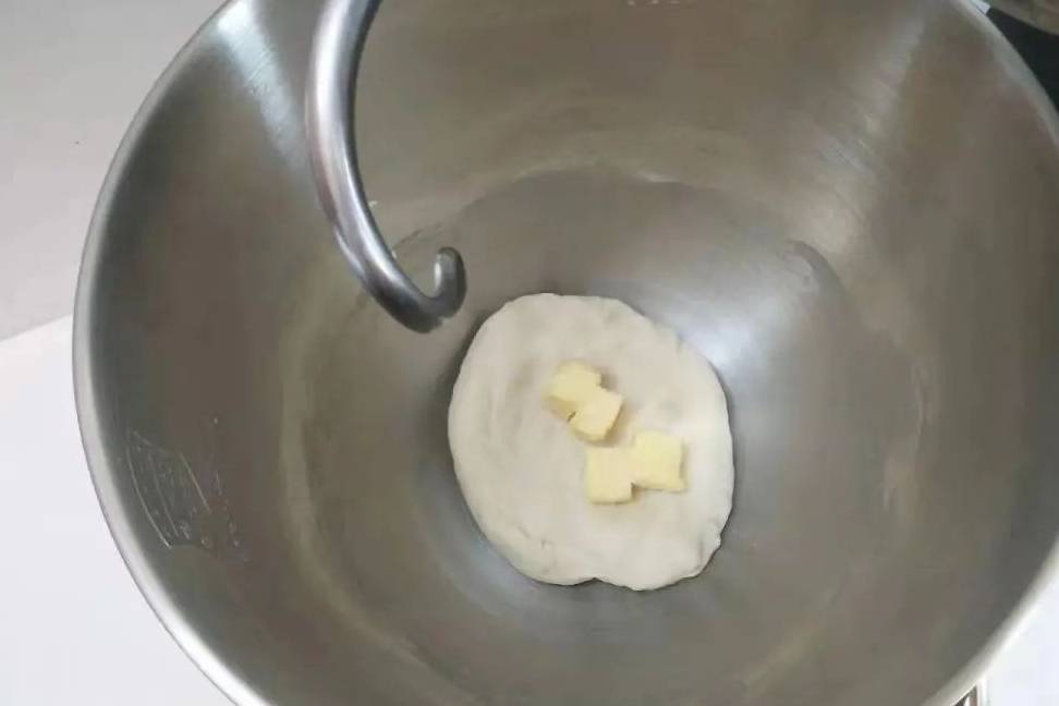 步骤1把除黄油和盐外的面团食材,按照底层液体,中层粉类,上层的酵母的顺序放入厨师机桶内。开1档,混合成团,转3档揉到面团可拉出粗膜的状态