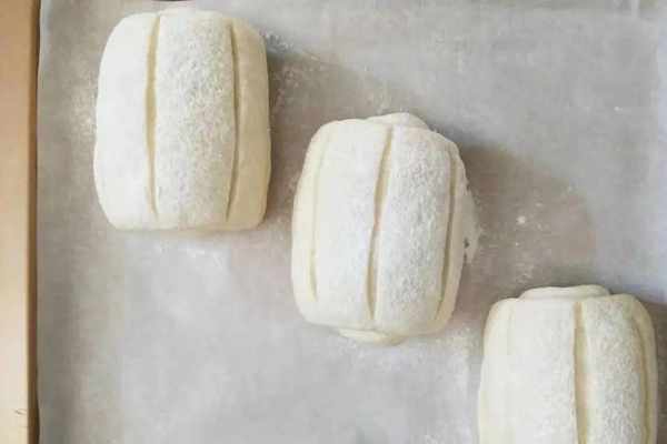 步骤14表面筛一层薄薄的面粉,再用刀片竖着划开5道口子