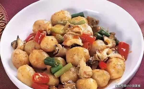 1将小土豆放入锅中煮沸,去皮并油炸,加热至50%的油,直至表面呈金黄色。将海螺用姜片和葱片煮至熟,去壳,取出肉,洗净下油待用。将青椒和红椒洗净,切成小块。