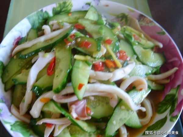 做法:1、鱿鱼须洗净切块;黄瓜一定要洗净切片;