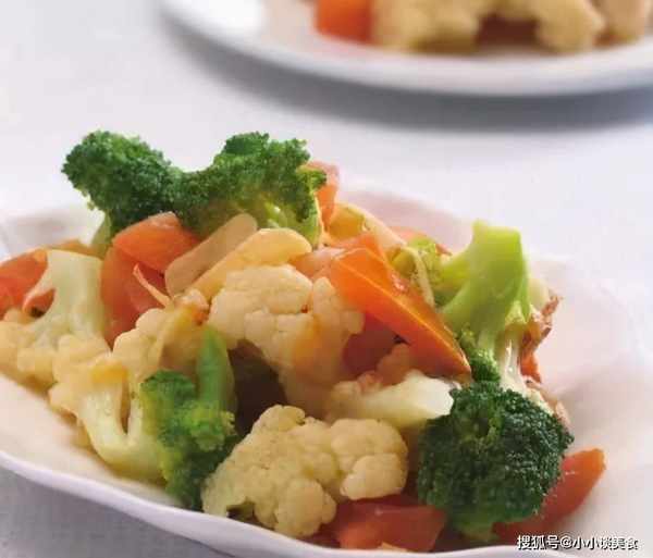 原料:花菜200克,西兰花150克,西红柿1个,盐、蒜、葱、姜、鸡精、色拉油适量。