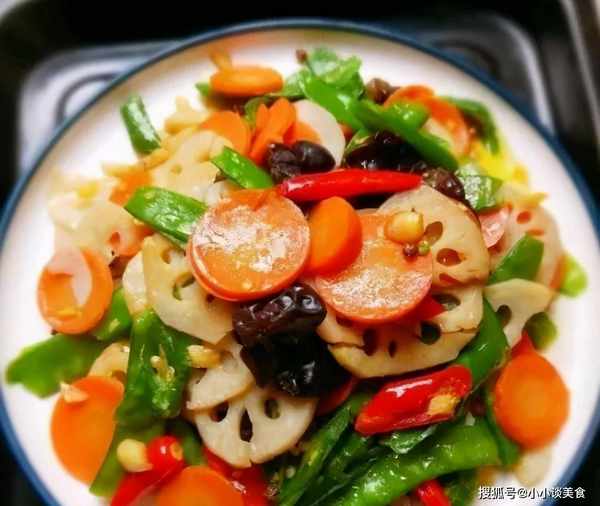 1、莲藕去皮洗净切片浸入冷水中,胡萝卜去皮洗净切片,木耳去蒂,荷兰豆去筋洗净备用。