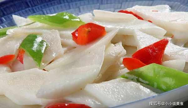 2.待肉快熟时,加入笋片翻炒至断。如果想要软一点,可以多炸一会。然后放入鸡精,拌匀后出锅。