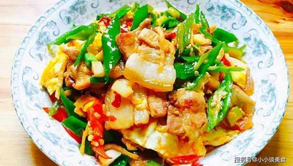 4、将五花肉略微烧焦,加入青红椒炒匀,然后倒入事先准备好的鸡蛋,加适量盐和鸡粉调味,翻炒均匀。辣椒半熟时,放入青蒜和蒜叶,倒入水淀粉勾芡,装盘。