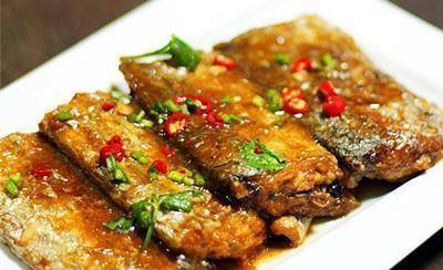 5、再放入带鱼翻炒,放入少许酱油及糖,起锅装盘。