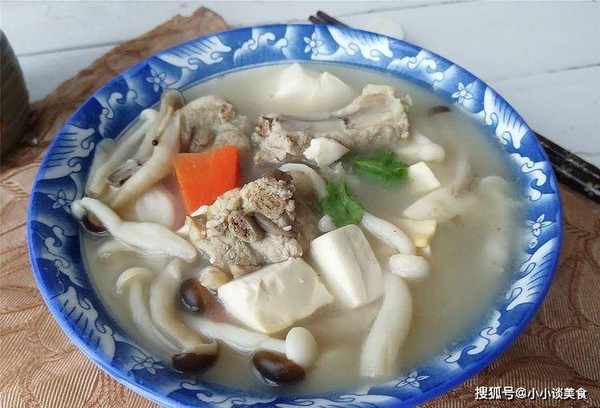 所需材料:豆腐1块、排骨400克、蟹味菇100克、白玉菇100克、胡萝卜1/2根、盐适量、葱1根、姜2片、1汤匙料酒、胡椒粉1/2茶匙做法: