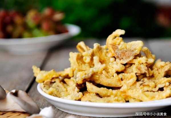 5、油温调高,加入香菇再炒,香菇炸得金黄酥脆,捞出平衡油,撒少许盐和胡椒粉。如果喜欢吃辣的,还可以撒些辣椒粉和孜然粉。
