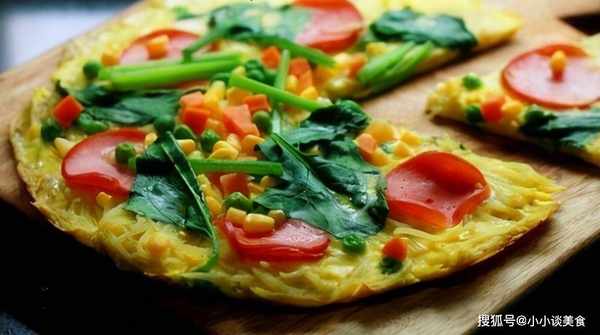 2、用中火加热锅底较厚的平底锅,平底锅涂上一层油;将步骤2准备好的土豆蛋液倒入锅中,用刮刀抹平。将热量降至中低。火要小;将菠菜、胡萝卜、青豆、玉米粒和火腿快速铺在土豆鸡蛋混合物上;