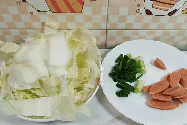 第3步:切好白菜、香葱、火腿肠;也可以用腊肠、肉末都不错或者全素煲也一样味美;
