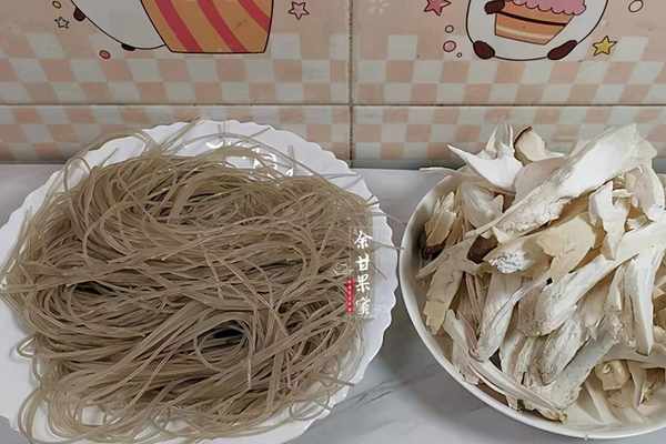 第2步:红薯粉条要用温水泡发,热水泡发减少时间,但是在口感上不如冷水泡发的更劲道,冷水泡发的粉条耐煮,不易碎;另将杏鲍菇用手撕成条;
